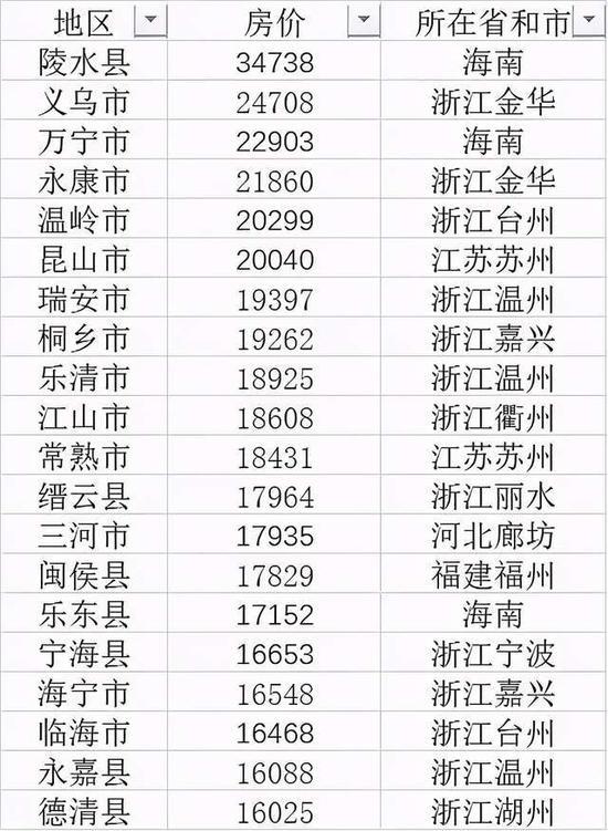 在房价最高的20个县中,浙江上榜13城,海南、江苏各3席,河北一席。海南陵水县拔得头筹,以3.4万的均价高居榜首。