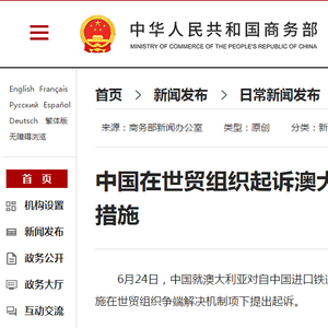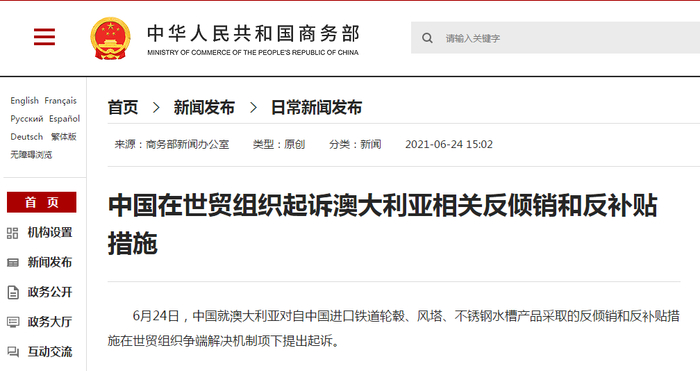 据《环球时报》记者从商务部获得的消息,6月24日,中国就澳大利亚对自中国进口铁道轮毂、风塔、不锈钢水槽产品采取的反倾销和反补贴措施在世贸组织争端解决机制项下提出起诉。在此之前的2020年12月和今年的6月,澳大利亚分别就中国对澳大麦和葡萄酒相关产品进行的“双反”,在世界贸易组织提出起诉。中国商务部新闻发言人高峰在24日下午的新闻发布会上表示,中方希望通过将澳方有关反倾销反补贴措施诉诸世贸组织争端解决机制,既维护中国企业的合法权益,同时也是维护多边贸易体制和世贸组织的权威性有效性。