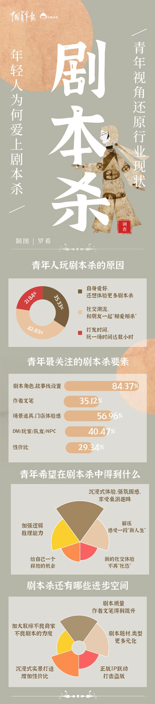 中青校媒调查显示,42.83%受访者玩剧本杀是为了满足社交需要,35.55%是出于个人爱好,还有21.84%则是为了打发时间。