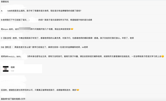 而让同在长沙的辅导老师刘涵感到困扰的是,自己的个人号需要假扮家长进到家长群,内部的叫法是“鼓励师”,即扮演托儿。他的主管经常会在工作群中分享“鼓励师”的剧本,小组成员们的部分工作内容就是在各个家长群里互为“鼓励师”,在群里活跃气氛、“自问自答”。