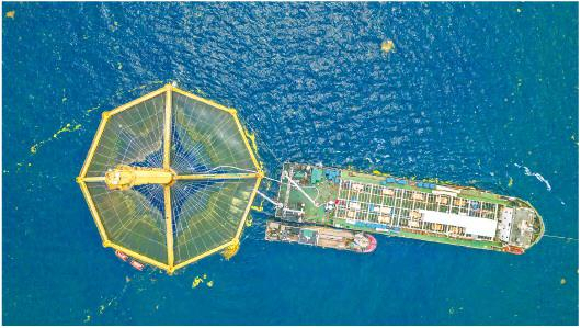 2018年,全世界最大的全潜式智能网箱——“深蓝一号”启用,装备于黄海冷水团三文鱼养殖项目。这座相当于40个标准游泳池大小、质量超过1500吨的“巨无霸”,总投资1.15亿元,是我国在深远海渔业养殖装备自主设计研发上取得的重大突破,具有完全独立的知识产权。与国外主产区相比,利用“深蓝一号”在黄海冷水团养殖的三文鱼,成鱼快、品质优、病害少、人工与物流成本低。水温适宜的前提下,预计每年可收获30万条成品三文鱼,产量超过1500吨,年产值超过1亿元。