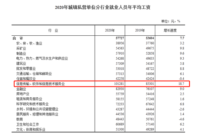 从上图不难看出,在城镇私营单位当中,去年仅有信息传输、软件和信息技术服务业的平均工资超过了10万元。