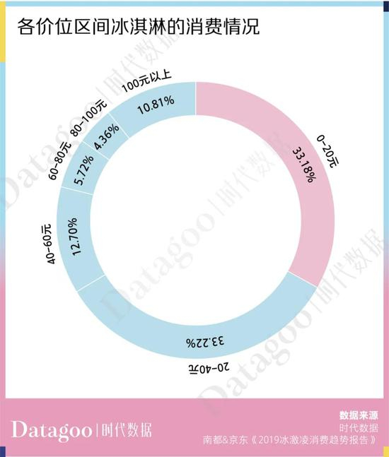 《 2019 冰激凌消费趋势报告》显示, 2019 年冰激凌价格区间在 20-40 元之间的组合装,在京东整个平台的消费占比 33.22% ,高于 0-20 元之间 33.18% 的消费占比。100 元以上的冰激凌组合装竟然也受到青睐,占比接近 11% 。