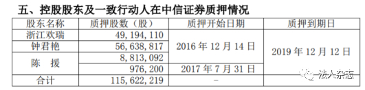 但钟君艳、陈援和浙江欢瑞并没有在质押到期日对股票进行回购,质权人中信证券于2020年申请了仲裁,要求钟君艳等人支付7.14亿元的回购款及违约金。