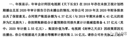 由张涵予主演的古装大剧《天下长安》本应在2018年播出,但一直到2020年年报审计日,该剧都未能播出,会计事务所因此对欢瑞世纪2019年年报和2020年年报出具了保留意见。