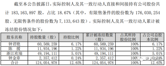 6月18日,欢瑞发布实控人及一致行动人股权被冻结公告。公告显示,欢瑞实控人钟君艳及陈援、浙江欢瑞和钟金章等三位一致行动人累计股权近7成被司法冻结。