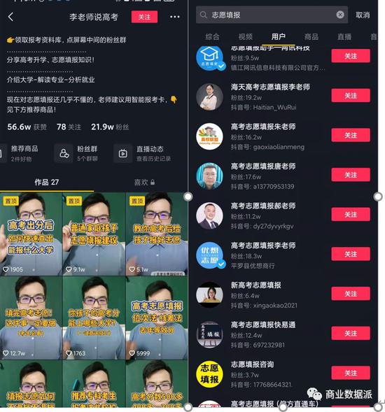 飞瓜数据显示,最近一周内(6月22日~28日),抖音账号“贾老师报考”的直播销售额达62.6万,“胡老师说高考”的直播销售额更是达到了168.8万。