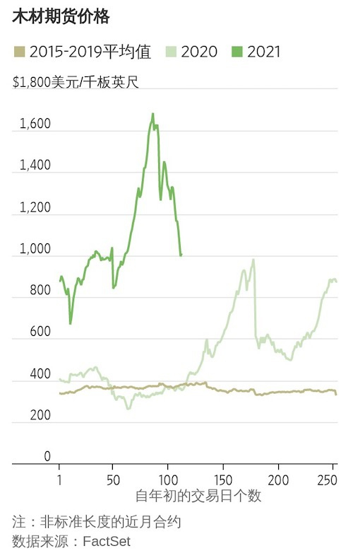在房价上涨的原因里,原料木材价格一直在飙升,整个一季度可谓“一木难求”,因此建筑成本自然会转嫁到房价。年初以来,大宗商品涨价潮席卷全球,供给短缺、流动性炒作等都是关键因素。每千板英尺木材从疫情前的高位813美元。一度飙升到5月初的1481美元。不过,近期木材已经回落近50%了。