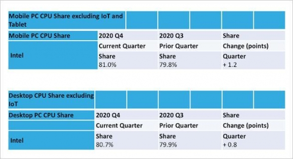 但是在移动端CPU和服务器CPU中,依旧是英特尔的天下,移动端CPU占比几乎都在80%以上,而在服务器CPU领域,2021年一季度AMD仅占比1.2%。