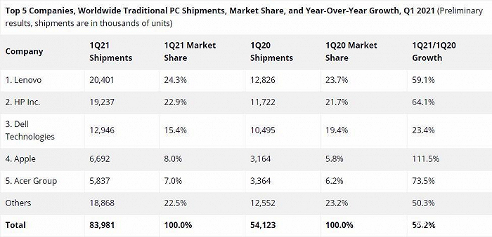 可以很明显的看到,全球PC市场总出货量达8398万台。虽然环比下降8%,但对比上年同期的5412万台增长了55.2%,增速强劲。