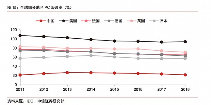 上图展示了全球几个发达国家和中国电脑的渗透率,目前中国的渗透率只有20%左右,而以美国,法国等为首的发达国家的电脑渗透率普遍在60%以上,中国市场存在明显的渗透率提升机会。