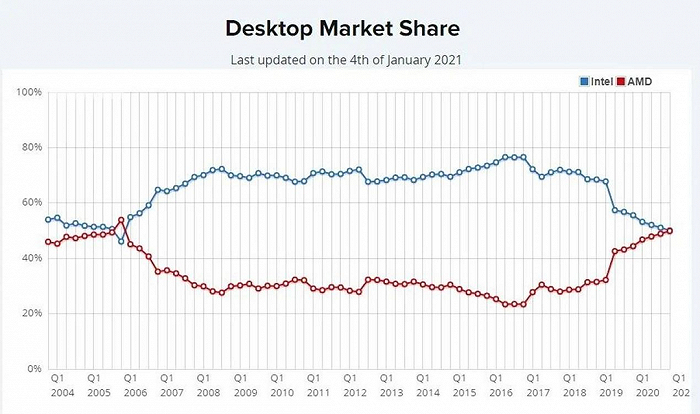 根据Passmark 测评网站上公布的数据,2021年一季度,AMD在桌面CPU的市场份额时隔15年终于再次反超英特尔,占据了台式机CPU市场50.8%的份额。