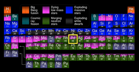 从元素起源上讲,只有宇宙中一些极为激烈和罕见的天文事件,比如当一个老年的大质量恒星死亡时发生的超新星爆炸(Dying low-mass stars),或者中子星的碰撞(Mergingneutron stars),产生的能量才可能使较轻的原子核结合成像钯一样的贵金属元素。因此散布在宇宙空间中的钯含量并不多,最终出现在太阳系和地球上的钯就更少了。