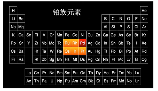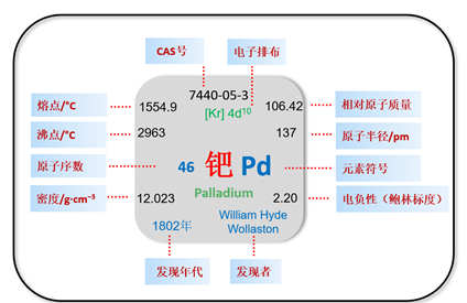 钯元素位于第五周期第Ⅷ族,元素符号Pd,处在现代元素周期表的中心位置。它和周期表附近区域的钌(Ru)、铱(Ir)、铑(Rh)、锇(Os)和铂(Pt)的性质很接近。铂是其中储量相对较多、最先被发现的元素,所以它们一起被称为“铂族元素”。钯的发现也与铂矿石的研究有着密切的联系。
