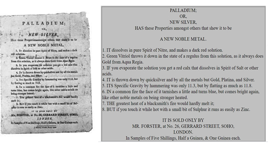 1803年,伦敦的很多科学家收到了一份神秘的广告宣传单。宣传单中称 “钯”为“新银”(new silver),是一种新的贵金属,并列举了钯的一些物理化学性质。宣传单并没有提到谁是钯的发现者,而只是指明Forster先生是独家销售代理。一份钯样品的价钱,约是当时同等黄金价格的6倍。