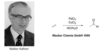 伴随二战后欧洲重建工作,人们对于塑料和精细化工品的需求呈现爆炸式增长。德国化学家Walter Hafner起初希望借助含钯催化剂从乙烯合成环氧乙烷,却意外得到了另一种重要的化工原料乙醛,后来这一方法实现了商业化生产,并被称为瓦克尔法(Wacker process)。自此,钯作为催化剂开始在有机合成反应中崭露头角。