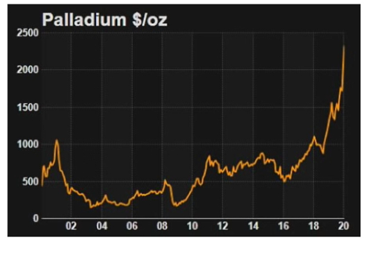 钯在有机合成以及生物医药中的应用日益广泛,但由于这些应用往往只需要毫克量级的钯元素,并非大宗商品,所以还不足以解释它近年来价格的飞涨。