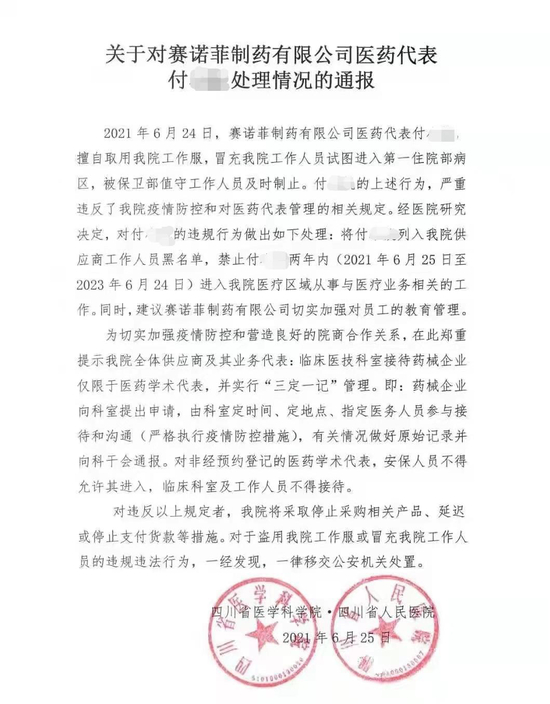 6月25日,一则《关于对赛诺菲制药有限公司医药代表付某处理情况的通报》流出,四川省人民医院、四川省医学科学院联名警告赛诺菲:建议赛诺菲制药有限公司切实加强对员工的教育管理。