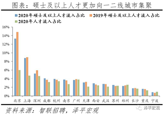 2020年应届生、硕士及以上人才将简历投向北上深广的比重分别占比20.7%、30.9%,均高于流动人才流向北上广深的整体比重19.07%,应届生和硕士及以上人才更倾向往一二线城市集聚。从应届生看,应届生人才流入占比前四名分别是北上深广,合计占比20.7%,高于北上深广的人才流入占比19.1%;应届生人才流入前十城市还有成都、杭州、南京、郑州、西安、武汉,前十合计占比40.0%,高于前十城市的人才流入占比35.5%,意味着和流动人才相比,应届生人才更加向一二线城市集聚。和2019年相比,2020年流入北京、广州、上海的应届生占比分别下降1.3%、0.9%、0.9%,流入武汉、杭州的应届生占比分别上升0.2%、0.2%。从硕士及以上人才看,硕士及以上人才流入占比前四名分别是北上深和成都,合计占比31.3%,高于北上深成人才流入占比的18.5%;硕士及以上人才流入前十城市还有杭州、广州、南京、天津、西安、武汉,前十合计占比51.4%,高于前十城市的人才流入占比35.1%,意味着和流动人才相比,硕士及以上人才也更倾向往一二线城市集聚,尤其是向一线城市集聚。和2019年相比,流入北京、深圳的硕士及以上人才占比分别下降1.5%、0.8%,流入成都、西安、苏州、南京的人才分别上升0.4%、0.3%、0.2%、0.2%。
