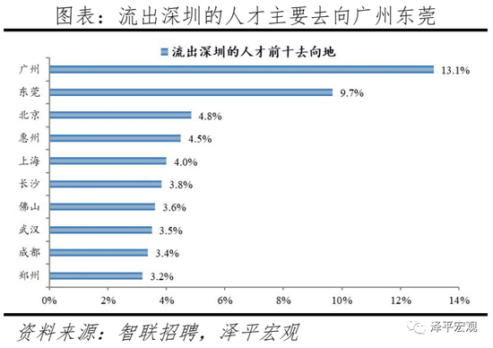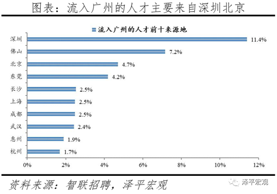 3)深圳:2017-2020年人才净流入占比分别为0.1%、0.4%、0.2%、1.3%,主因新兴产业发展速度快、宽松且不设指标上限的入户政策;深圳和广州互为人才外流第一目标城市,深圳流向广州和广州流向深圳的人才流出在全国流动人才总量中占比分别为0.7%、0.6%,规模基本平衡。2015年深圳常住人口增量从2014年的15万大幅上升至60万,2015-2019年平均增量为53万。2017-2020年深圳人才流入占比基本稳定在4.8%左右,分别为5.1%、5.0%、4.7%、4.6%,但人才流出占比呈下降趋势,分别为5.0%、4.9%、4.6%、4.6%、3.3%。从来源看,人才向深圳流入的前十大城市分别为广州、北京、东莞、上海、武汉、长沙、惠州、成都、佛山、西安,合计占比达43.0%,低于2019年前十来源地的52.8%,深圳的人才来源集中度有所下降。其中,珠三角城市有4个,占比22.5%;流入深圳的人才中12.0%来自广州,流入广州的人才中11.40%来自深圳,深圳和广州互为人才来源城市的第1位。人才流入深圳主要因为经济发展速度相对较快和人才政策有吸引力。2020年深圳GDP增速3.1%,高于全国平均的2.3%,也远高于广州、上海和北京的2.7%、1.7%、1.2%;2016-2020年深圳平均GDP增速为7.0%,高于广州、上海、北京的6.2%、5.6%、5.5%。深圳还拥有华为、腾讯、平安等众多著名企业,尤其是互联网企业,吸引大量人才。深圳的落户政策逐渐放宽,且补贴幅度较大,根据深圳市人力资源和社会保障局数据,2016年深圳将全日制本科生、硕士、博士的租房相关补贴从6000、9000、12000元分别提高至15000、25000、30000元,2017年落户门槛放宽至35岁以下专科学历人才,对新引进的两院院士和杰出人才、地方级领军人才、后备级人才分别给予300万、200万、160万的奖励。从去向看,深圳人才外流的前十大城市分别为广州、东莞、北京、惠州、上海、长沙、佛山、武汉、成都、郑州,合计占比达53.7%,与2019年前十去向地的53.9%接近持平,深圳人才流向的方向无明显变化。其中,广州占比达13.1%,珠三角城市有4所,合计占比31.0%,深圳和珠三角地区人才流动频繁;流出深圳的人才中13.1%流向广州,流出广州的人才中18.7%流向深圳,深圳和广州互为人才外流目标城市的第1位,深圳流向广州和广州流向深圳的人才流出在全国流动人才总量中占比分别为0.4%、0.6%,规模基本平衡。2020年流入、流出深圳的行业人才中IT|通信|电子|互联网占比达30.7%、29.3%,均远高于其他9个城市,深圳IT|通信|电子|互联网行业人才流动频繁。