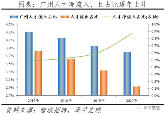 4)广州:2017-2020年人才净流入占比分别为0.5%、0.5%、0.6%、0.9%,人才净流入且持续稳定增长,主因广州发展速度较快、生活成本在一线城市中最低。广州常住人口增量总体呈上升趋势,2011-2019年从4万升至40万。2017-2020年广州人才流入占比基本稳定在4.1%左右,分别为4.3%、4.2%、3.9%、3.8%,略呈下降趋势,人才流出占比持续下降,分别为3.8%、3.6%、3.3%、2.9%,流入大于流出,使得人才净流入占比分别为0.5%、0.5%、0.6%、0.9%,逐年上升。从来源看,人才向广州流入的前十大城市分别为深圳、北京、佛山、东莞、上海、长沙、成都、武汉、惠州、杭州,人才流入占比合计达41.0%。其中,深圳占比11.4%,珠三角城市有4个,合计占比24.6%。人才流入广州主要因为发展速度较快、生活成本较低。2019年广州GDP增速为6.8%,高于北京、上海、深圳的6.1%、6.0%、6.7%;2020年广州GDP为2.7%。高于全国平均2.3%。广州的生活成本在一线城市中最低,根据英国经济分析智囊机构经济学人智库(EIU)发布的《2019年全球生活成本调查报告》,在全球133个城市样本中,上海与深圳排名并列第25位,北京、广州分别排名49、68位;2019年北京、上海、深圳、广州的房价收入比分别为26.5、22.0、21.4、13.2年,广州的房价和生活成本在一线城市中最低。2020年广州流入人才的13.3%、4.1%流入贸易、批发、零售、租赁业,以及服务业,明显高于其余9个重点城市。从去向看,广州人才外流的前十大城市分别为深圳、佛山、东莞、珠海、北京、上海、杭州、惠州、中山、长沙,人才流出占比合计达58.2%。其中,深圳和佛山占比分别为18.7%、12.2%,珠三角城市有6个,合计占比46.2%,高于2019年的44.9%与北京14.49%的人才流向京津冀都市圈、上海34.6%的人才流向长三角都市圈和深圳32.3%的人才流向珠三角都市圈相比,广州人才流向珠三角都市圈城市的比重显著更高。一方面是因为珠三角多为粤语城市、文化相近,另一方面是广州高校数量较多,广东省人才为求学向广州集聚,毕业后从广州回流至省内其他城市。根据教育部数据,广州普通高校数、211高校数分别为37、6所,分别排名第5、6名;根据国家统计局数据,2019年广州普通本专科在校生人数为114.1万人、位列全国第一。