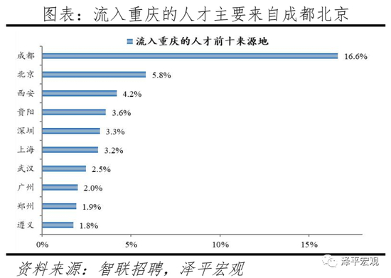 3)重庆:2017-2020年人才净流入占比分别为-0.1%、0.5%、0.3%、-0.2%,2018年由负转正主因对信息技术产业具有较强的人才吸引力,至2020年信息技术产业人才吸引能力有所下降,带动人才净流入转负。重庆常住人口增量维持在高位,2011-2019年增量平均为27万。2017-2020年重庆人才流入占比总体呈上升趋势,分别为1.3%、2.0%、1.8%、1.3%,人才流出占比分别为1.4%、1.4%、1.6%、1.5%,导致人才净流入占比分别为-0.1%、0.5%、0.3%、-0.2%,近年波动较强。从来源看,人才向重庆流入的前十大城市分别为成都、北京、西安、贵阳、深圳、上海、武汉、广州、郑州、遵义,合计占比达44.8%。其中,成都流入重庆占比达16.6%,高于大部分城市第一来源地占比,主要因为地理位置近且电子产业等具有较强吸引力。2019年重庆流入人才中25.7%流向IT|通信|电子|互联网行业,高于除杭州外的其余8个重点城市,也明显高于流出人才从事该行业的比例13.1%,但2020年流入人才中流向IT|通信|电子|互联网行业的人才仅20.4%,在10个重点城市中仅比天津略高,重庆对IT|通信|电子|互联网行业人才吸引力大不如前,而流入人才中流向房地产|建筑业的占比达16.6%,高于其余9个城市,但低于流出人才中房地产|建筑业的比重26.3%。根据国家统计局和中国电子信息产业统计年鉴数据,重庆自2018年以来聚焦工业互联网基础设施建设与重点突破,规模以上电子信息企业个数2008-2017年从68个增加到540个,至2019年底增至639家;全国软件和信息技术服务业信息平台显示,2020年10月重庆软件业务收入增速16.3%。从去向看,重庆人才外流的前十大城市分别为成都、上海、深圳、北京、广州、杭州、武汉、西安、贵阳、长沙,合计占比达51.0%。