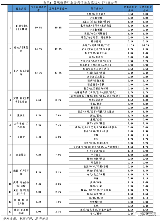 6)从行业看,流动人才中50.3%分布在IT、房地产、制造业,高于求职人才总体的48.0%。2020年求职人才最多的前三行业是IT|通信|电子|互联网、房地产|建筑业、生产|加工|制造,分别占比19.8%、14.9%、13.3%,合计占比48.0%;流动人才最多的前三行业也是上述三个行业,分别占比19.1%、17.4%、13.8%,合计占比50.3%,说明流动人才分布更加集中,且流动人才在房地产|建筑业的分布远高于所有求职人才。从二级行业分布来看,2020年求职人才最多的前五行业分别是房地产/建筑/建材/工程、互联网/电子商务、教育/培训/院校、专业服务/咨询(财会/法律/人力资源等)、零售/批发,合计占比35.9%;流动人才最多的前五行业则略有不同,第五名为电子技术/半导体/集成电路,合计占比37.8%。