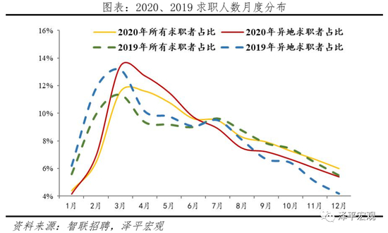 数据说明及特征:智联招聘拥有约2.3亿个人注册用户,日均活跃用户数(含登录、有求职行为的用户)约630万,其中,求职人才即当年有简历投递行为的用户中约90%为专科及以上学历,远超全国就业人口总体的14.6%(2015年小普查数据);在求职人才中,约四成为跨城求职者,即现居住城市和简历投向城市不同的流动人才,2020年由于疫情,跨城求职者比2019年减少2.3%。人才求职和跨城求职具有明显的月度波动性,求职高峰一般在春节后的3月,2020年由于疫情,求职高峰稍微后移,2020年3月求职人数和流动人数占比分别为11.6%、13.4%,2019年分别为11.3%、13.1%。