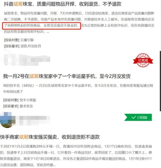 与董先生珠宝一样,斌哥、吴震带的珠宝银饰也引来了一些消费者的投诉。在黑猫投诉上,有用户投诉称,在斌哥珠宝直播间购买了宣称是999金的镯子,但去珠宝店鉴定后,鉴定结果不是纯金。不过这位用户尚未晒出鉴定结果截图。
