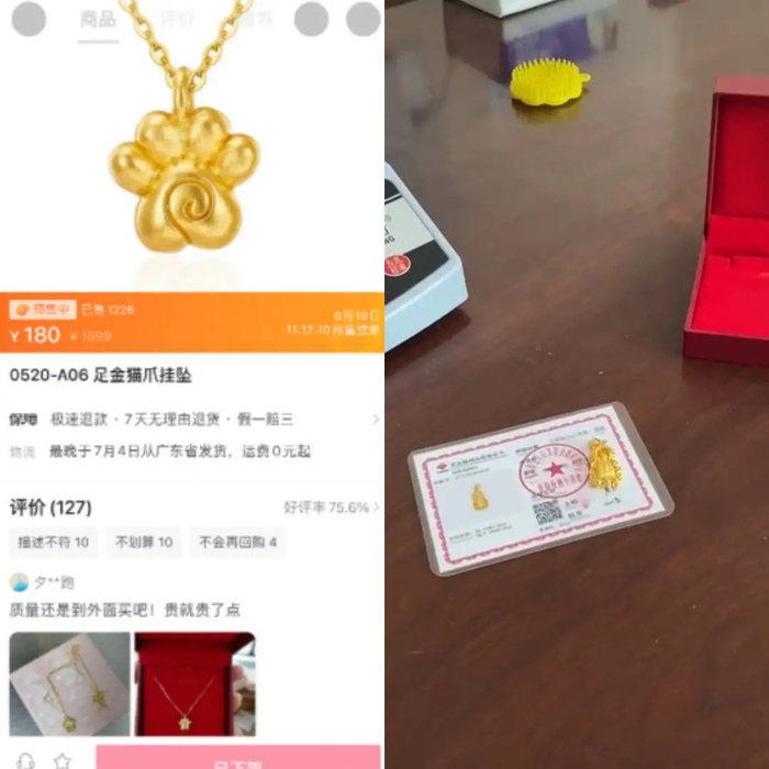 “看直播时,他(董先生)拿的猫爪吊坠有一颗‘葡萄’那么大,等到了我手里,却变成‘葡萄籽’那么小。”曹冲用黄金克数比重测评仪测过之后发现,这个猫爪吊坠大概率是空心的,克重只有0.2克左右。按照180元的秒杀价,相当于900元/克,而近期市面上的金价在300元/克到400元/克之间,他瞬间觉得自己被套路了。