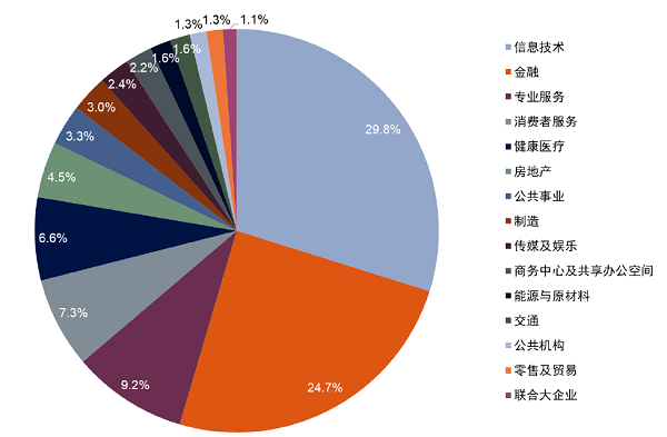 信息技术(29.8%)及金融(24.7%)类企业的租赁成交占据了写字楼市场承租面积的前两名,二者之和高达54.5%