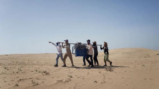 2018年 宁夏银川 场务扛着设备在沙漠中前行