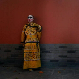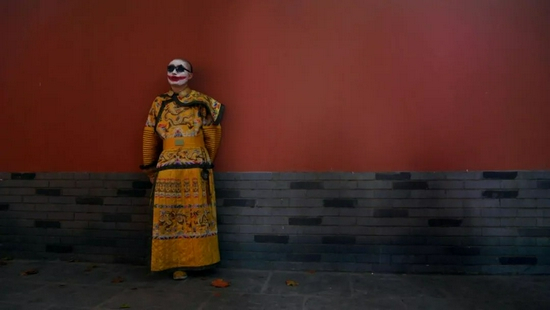 2014年 北京 画着小丑妆的皇帝靠在红墙上