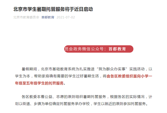 为解决学生暑期“看护难”问题,日前教育部印发了《关于支持探索开展暑期托管服务的通知》,引导支持有条件的地方积极探索开展暑期托管服务工作。