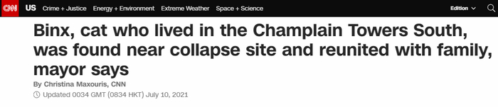 原标题:佛州官员宣布坍楼事故中一只猫咪幸存,网友:但有100多人死亡失踪......
