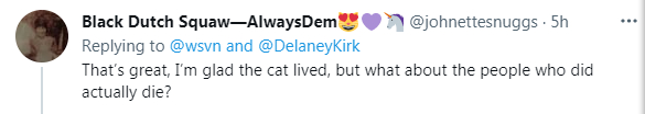 同时有网友反问道:“我很高兴这只猫活下来了,但那些真的死了的人呢?”