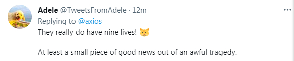 此事也引起外界关注,在社交媒体上,不少网友为这只猫感到高兴。有网友感叹称,“一场可怕的悲剧中至少传来一点好消息。”↓
