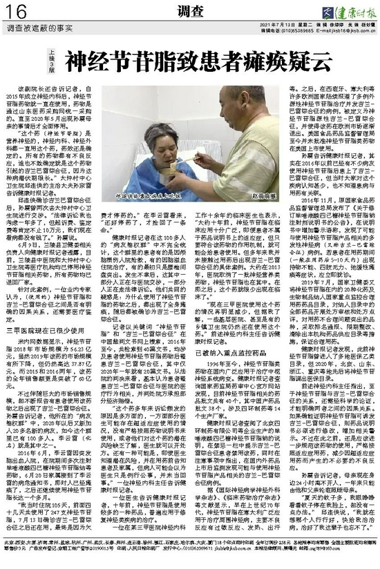 本文刊自:2021-07-13健康时报《年销售超30亿元 神经节苷脂致患者瘫痪疑云》(健康时报 赵萌萌 邱越 徐婷婷 寇晓雯 杨秋蓉 海报/刘陆宁)