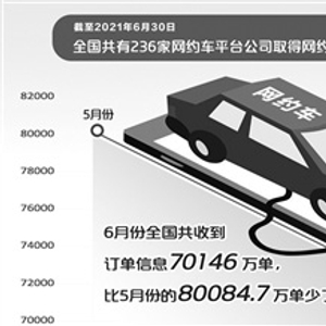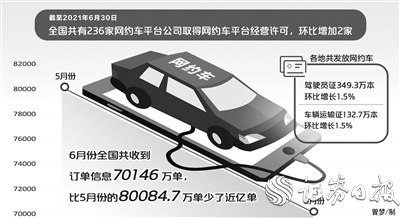 7月10日,网约车监管信息交互平台发布了2021年6月份网约车行业运行基本情况。截至2021年6月30日,全国共有236家网约车平台公司取得网约车平台经营许可,环比增加2家;各地共发放网约车驾驶员证349.3万本、车辆运输证132.7万本,环比分别增长1.5%、1.5%。