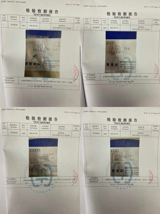 为确定前述原料卖家所售白色粉末是否为“西布曲明”,记者将从卖家处现场采集的疑似西布曲明原料样本送到北京清析技术研究院检验检测,结果证明王军山、唐顺、马阳、王垚鑫四名卖家提供的白色粉末中西布曲明均为“阳性检出”。北京清析技术研究院提供的检验检测报告显示,四份样品中西布曲明的检出含量分别为7.53x10⁵ μg/g、8.12x10⁵ μg/g、6.65x10⁵ μg/g、9.74x10⁵ μg/g,均为高纯度原料。
