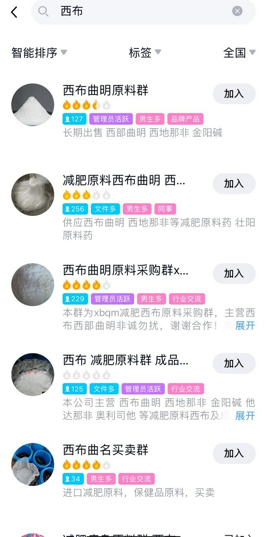 6月3日,记者以“西布曲明、减肥原料、XB”等关键词在腾讯QQ检索发现,该平台存在大量销售西布曲明原料的社群,粗略统计数量达50余个,群成员从几十人到上千人不等。其中一个成员数最多的QQ群达2000余人,而这一数字在记者加群后的十余天里增加了数百人。