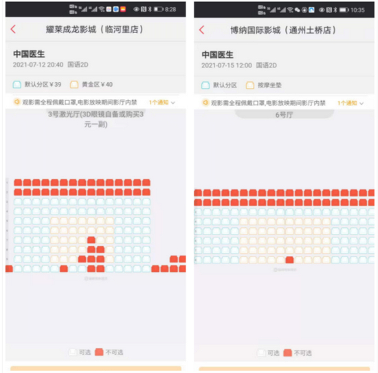 值得一提的是,《中国医生》在一些影院出现了“刷票房”的现象。京津冀地区电影从业者李刚7月15日对时代财经表示,他观察到在第三方售票软件上,一些放映《中国医生》的影院场次,出现前排座位、边角座位被提前选中的情况。
