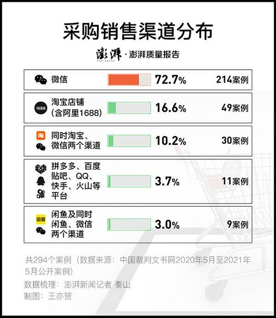 记者梳理发现,前述294个案件中,通过淘宝店铺铺销售的案例49起,占比16.6%;淘宝与微信两种渠道结合销售的案例30起,占比10.2%;通过拼多多、百度贴吧、QQ、快手、火山等平台销售的案例11起,占比3.7%;通过闲鱼、微信两种渠道结合的案例9起,占比3.0%。