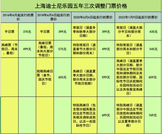 上海迪士尼票价调整情况 制表:时代周报记者谢江珊