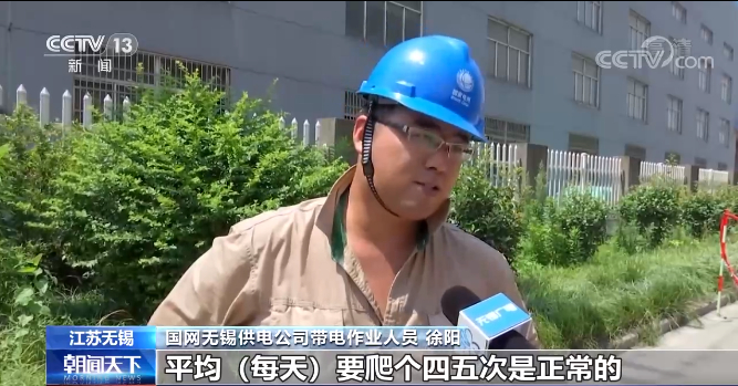国网无锡供电公司带电作业人员 徐阳:基本上,我们班组平均(每天)要爬个四五次是正常的,要保证我们后面居民的用电。不然的话,老百姓(在)炎热的夏天,他们也不舒服。