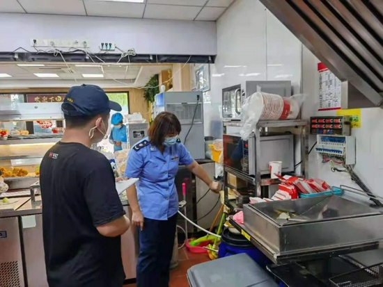 禾山市场监管所执法人员在华莱士门店后厨进行检查