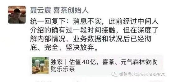 喜茶创始人聂云宸在朋友圈公开表示:“消息不实,此前经过中间人介绍的确有过接触,但在深度了解内部情况、业务数据和状况后已经彻底、完全、坚决放弃。”