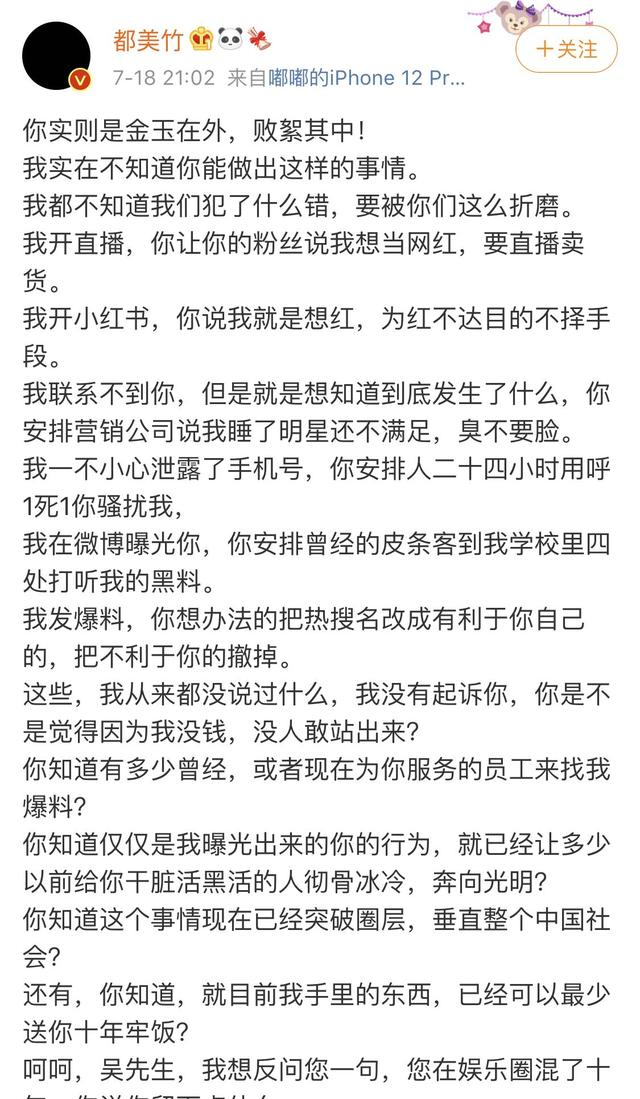 7月18日,都美竹发布的一条千余字爆料文,据后来网络写手徐某交代,该文是由都美竹提供素材,他撰写而成,文章内容经过“包装加工”。图片来源:都美竹微博截图