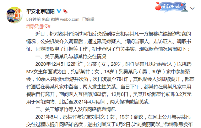 7月22日,北京朝阳警方发布了针对都美竹通过网络反映受到侵害和吴亦凡一方报警称被敲诈勒索的情况进行了通报。经过警方调查,吴亦凡和都美竹确有过两性关系发生,2021年6月,都美竹为了提升网络知名度,先后在网上发布被吴亦凡“冷暴力”的博文。当月,本事件中查明的犯罪嫌疑人刘某迢看到网络信息后产生对双方进行诈骗的想法,虚构了三个身份对都、吴双方实施了诈骗,最终获利18万元。
