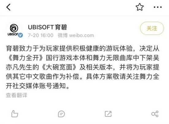如,7月20日下午,育碧表示,“育碧致力于为玩家提供积极健康的游玩体验,决定从《舞力全开》国行游戏本体和舞力无限曲库中下架吴亦凡先生的《大碗宽面》及相关版本,并将为玩家提供其它中文歌曲作为补偿。”